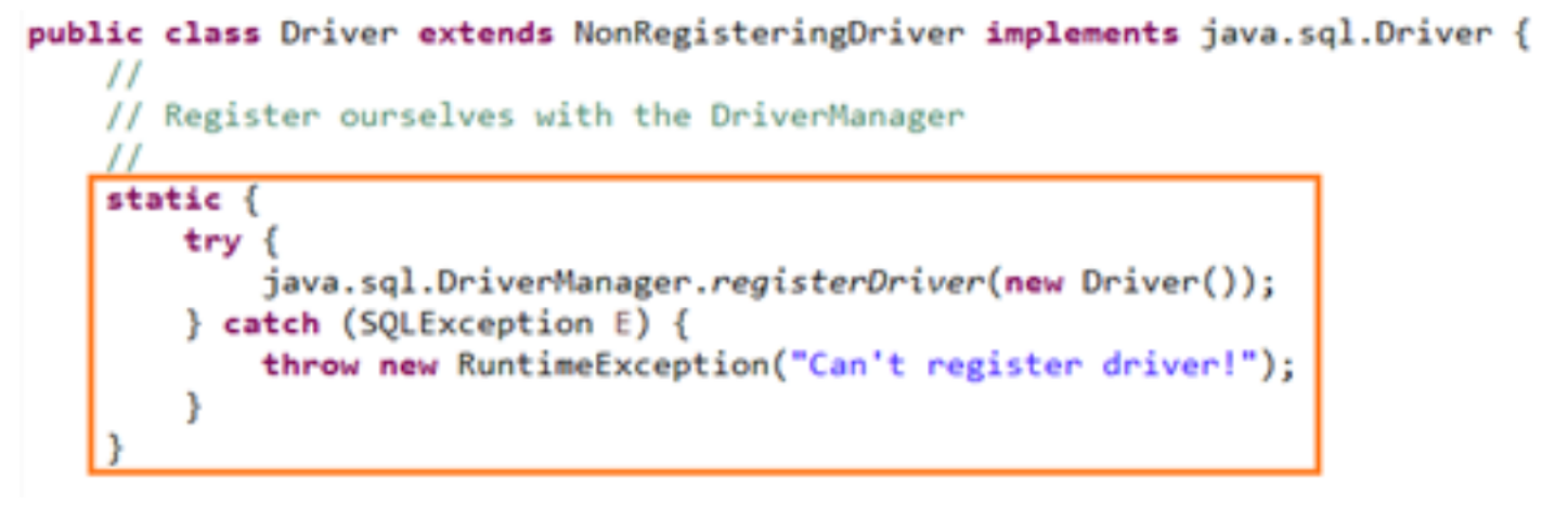 通常不用显式调用 DriverManager 类的 registerDriver()方法来注册驱动程序类的实例,因为 Driver 接口的驱动程序类都包含了 静态代码块,在这个静态代码块,在这个静态代码块中,会调用 DriverManager.registerDriver() 方法来注册自身的一个实例。